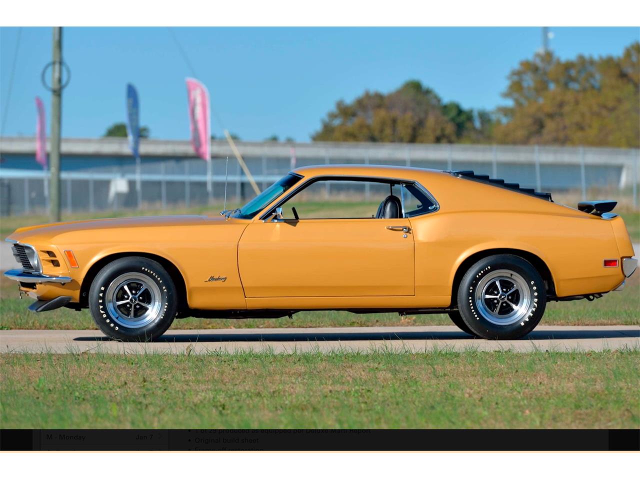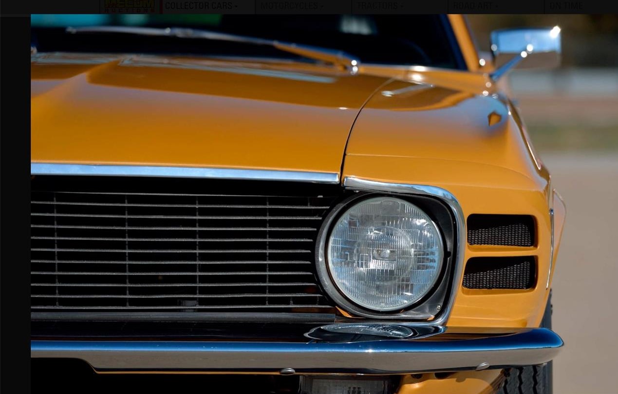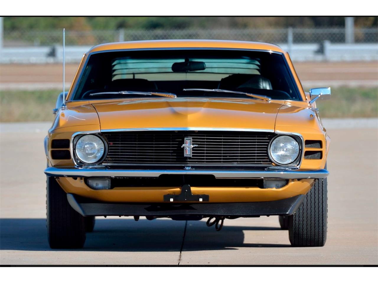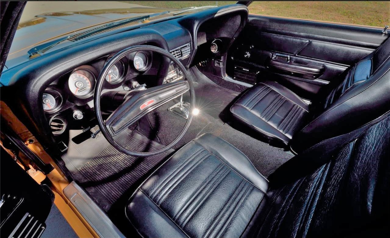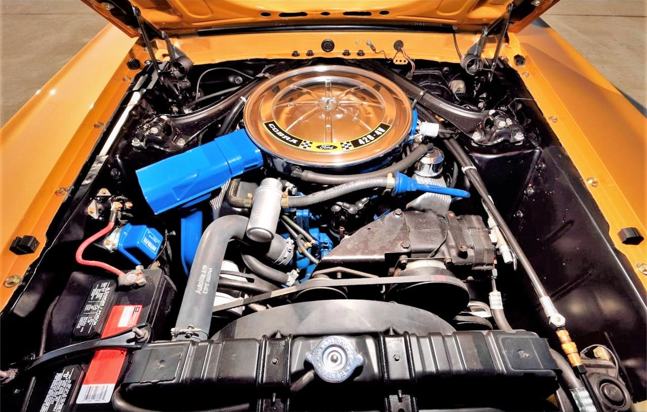 Everyone loves a sleeper. This 1970 Mustang may look like a standard SportsRoof, but the Q in the VIN indicates that it is factory equipped with the 428 Cobra Jet engine. Rotisserie restored in its original Bright Gold Metallic color, this fastback is one of only 29 non-Mach 1 1970 Mustangs with the Cobra Jet big-block; Other factory options include Select-Shift automatic transmission and 3.00:1 rear-end gears, along with additional extra-cost equipment including Select-Aire air conditioning, AM/FM radio with stereo door speakers, power steering and power front disc brakes. Owner added equipment includes a front chin spoiler, rear pedestal-mount spoiler, rear-window sport slats and chrome Magnum 500 wheels with F60x15 Goodyear raised white-letter Polyglas tires. The 428 Cobra Jet utilized low-riser 427 heads, a 390 GT camshaft, a 735 CFM Holley 4-barrel and free-flow exhaust manifolds to produce 335 HP and 440 lb-ft of torque. The engine is dressed with finned aluminum valve covers and the factory emissions system is intact. The drivetrain consists of Ford’s rugged C6 automatic and 9-inch rear end with 31-spline axles, all engineered to take the Cobra Jet's brute torque and horsepower. The Q-code version did not include functional Ram Air, so this non Mach Sportsroof came with a standard flat hood, providing a stealthy appearance.The interior is black standard Corinthian vinyl with high-back front bucket and non foldown rear seats. The factory build sheet is intact and accompanies the car, along with a framed deluxe Marti Report and a custom show board describing the car and its features.